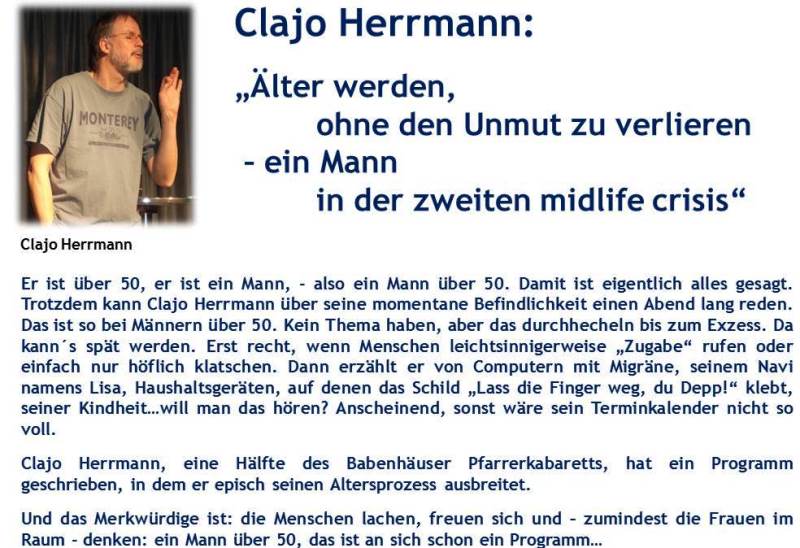 - 18.05.2014, 18:00 Uhr: Kabarettabend mit Clajo Herrmann im Luthersaal am Schwarzacher Hof