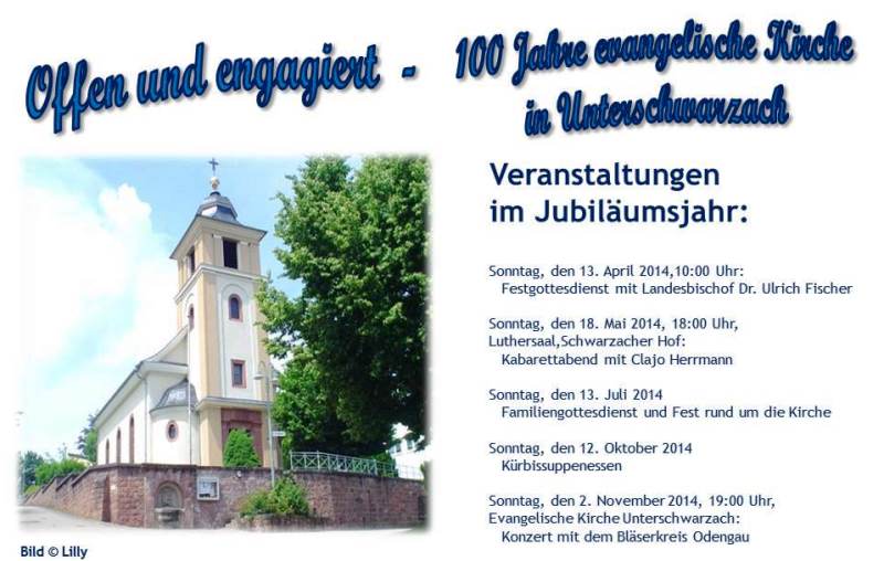 Am Sonntag den 13. 7. 2014 findet ein Familiengottesdienst und das Kirchfest anlässlich des 100jährigen Kirchenjubiläuums statt.