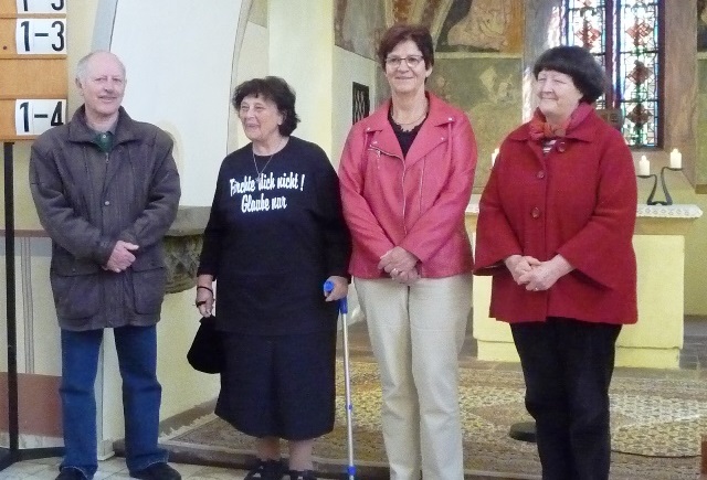 Am vergangenen Sonntag haben sich die vier Kandidaten für die Kirchenwahl im Gottesdienst vorgestellt. Es sind dies(auf dem Foto von links): Karl, Lenz, Viola Lenz, Regine Oelschlegel und Hildegard Wütschner.