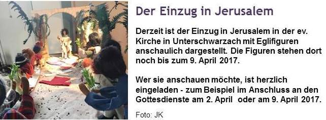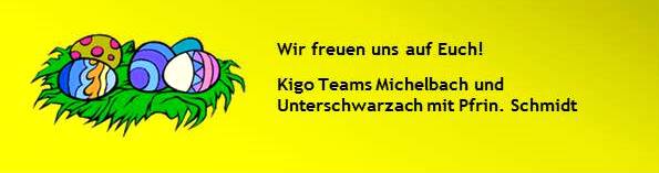 16.00-17.30 Kinderkreuzweg mit Fühl- und Erlebnistationen in der Kirche Unterschwarzach für Kinder mit ihren Eltern. Teilnahme ohne Anmeldung. Die Eltern werden gebeten, mit ihren Kindern um 18.30 in die Kirche nach Michelbach zu kommen. Die älteren Kinder sind eingeladen zu einer kleinen Wanderung nach Michelbach. Um 18.30 kleiner Imbiss im Pfarrhaus. Um 19.00 tragen die Kinder das Karfreitagskreuz des Kinderkreuzweges Unterschwarzach in den Gottesdienst in Michelbach.
