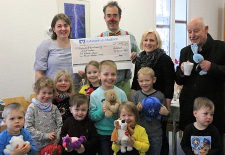 Auf dem Bild: Sandra Klenk undTamara Freiermuth vom Kigoteam mit Clown Pedro Mayor, Karl Lenz (KGR) und Kinder des Kigo Michelbach mit Kuscheltieren für die Krankenhausclowns.