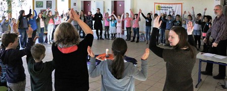 Im Rahmen des Gottesdienstes singen, spielen und tanzen Kinder aus der Grundschule Unterschwarzach zu moderner Musik.