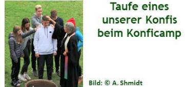 Einer unserer Konfirmanden ließ sich im Jugendgottesdienst auf dem Konficamp taufen. „Am dritten Tag des Konficamps war die Taufe für ihn in einer vertrauten Gemeinschaft aus Jugendlichen. Mich hat sehr gefreut, wie sich durch diese Taufe Kirchengemeinde und Jugendarbeit verbunden haben“, so Pfarrerin Angelika Schmidt. „Unsere Konfiteamer haben sich total ins Zeug gelegt auf der Freizeit und sehr viel mitgeholfen. Am Samstagabend spielte unsere Jugendband.“