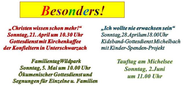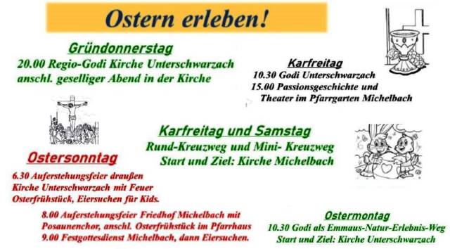 - 20.00 Uhr: Regionalgottesdienst mit Abendmahl und Frauengospelprojekt Kleiner Odenwald in Unterschwarzach.