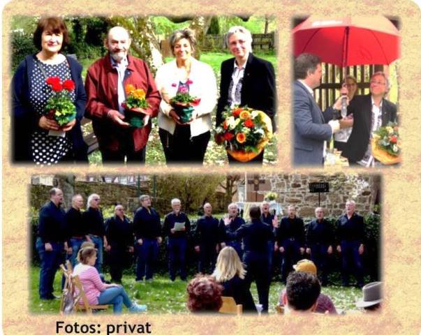 Gespannt waren dann alle auf die anschließenden „Spontanjubiläen“, zu denen Pfarrerin Schmidt eingeladen hatte. Tatsächlich stelle sich heraus, dass weitere zehn Gäste des Sonntags ebenfalls zehnjährige Jubiläen feiern konnten. Untermals wurde das Hof-Fest von fröhlichen Liedern des MGV und des Gesangvereins.