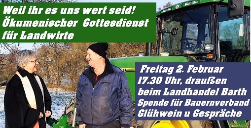 Aufgrund der aktuellen Situation der Landwirte hat es sich leider so ergeben, dass der kurzfristig geplante ökumenische Gottesdienst für Landwirte am 2. Februar ausgerechnet an dem Tag stattfindet, an dem in Aglasterhausen zum Neujahrsempfang eingeladen wird. Deshalb findet der Gottesdienst bereits um 17.30 Uhr statt. So wird es allen möglich sein, anschließend auch den Neujahrsempfang zu besuchen.