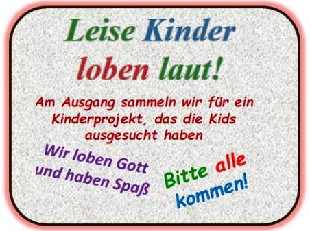 Die Spenden am Ausgang gehen an eine Schule für arme Kinder in Peru, deren Leiter und Pastor extra zu den Kindern in den Gottesdienst gekommen war. Er erzählte von seiner Schule und bedankte sich sehr für die Unterstützung.